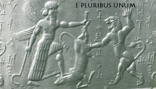 ancient seal (left) and the famous monument of a lion subduing man (right)